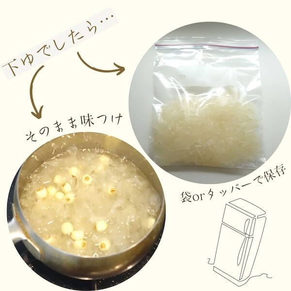 白きくらげは必ず下ゆでしたり、蒸したりしてから食べます。ここでひとつポイントが。白きくらげはとろとろにすればするほど、その潤い効果が高くなるといわれます。とろとろではなくても潤い効果はあるのですが、より効果が高まるということですね。