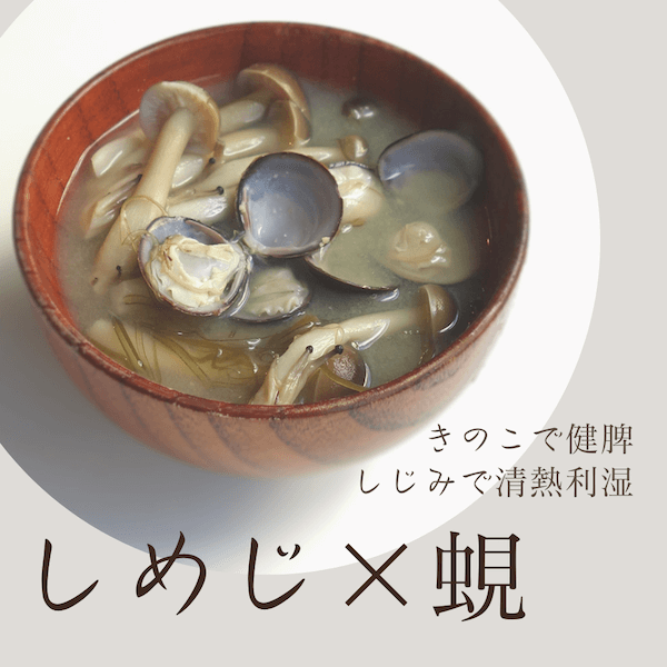 きのこの中でもオルニチンが豊富なしめじと、しじみを使った味噌汁です。薬膳的には、きのこは胃腸の働きを促進する健脾の効能を持ち、余分な痰飲を排出。しじみは体にこもった熱と湿、酒毒を取り除くので、薬膳的な相乗効果が期待できます。