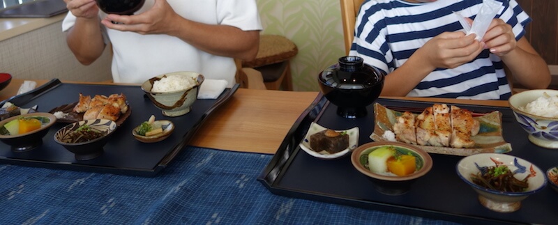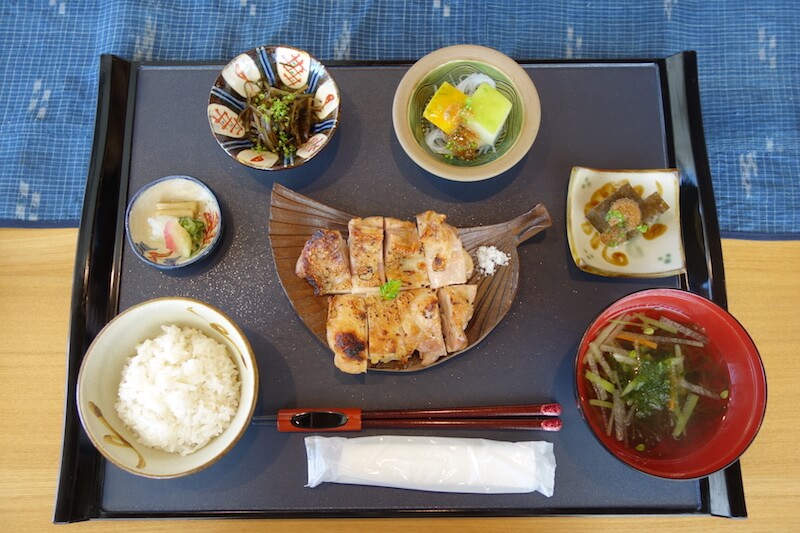 メインの鶏の塩焼きに、お汁と小鉢など盛りだくさんの定食。