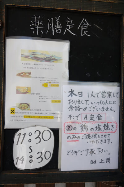 予約の電話をした際に「その日は一人で営業しているので、定食が一種類だけになります」と聞いていました。黒板にも、本日の薬膳定食は「鶏の塩焼き」と書いてあります。