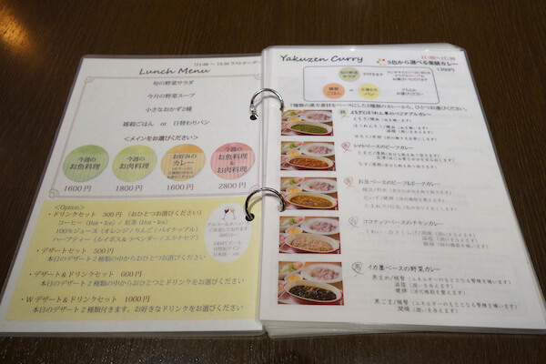 この日、私はカレーをオーダーしましたが、メインが選べる薬膳ランチ(11:00〜14:30)もかなり惹かれました!メインがお魚とお肉選べるそうです。ドリンクやデザートなどのオプションも豊富でした!美容や健康を気にするお友達同士の女子会などに良さそう…!