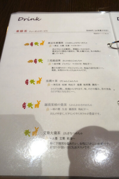 ほかにも黒豆生姜茶、三花温巡茶、羅漢果柿の葉茶がありました。薬膳茶って自分ではブレンドしにくいので、どれも気になります。
