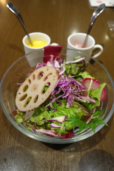 そうこうしているうちに、サラダが来ました!フレッシュな葉野菜に、根菜のトッピング。