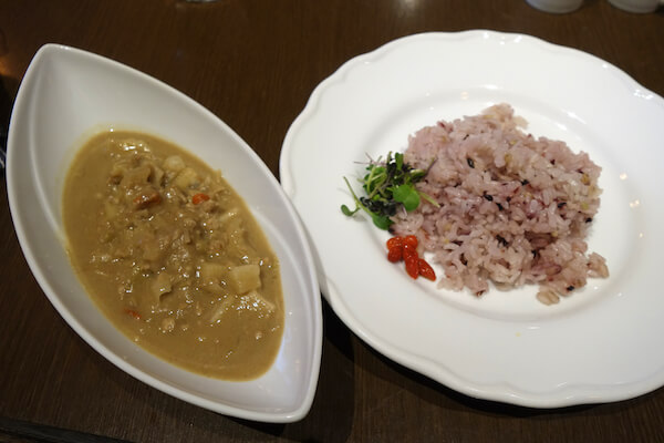 白のカレーのお味は、ココナツミルク入りなのでほんのり甘くて、後から少しピリッ。風味と食感の雑穀ごはんとの相性も抜群で、なめらかで食べやすいマイルドなカレーでした。