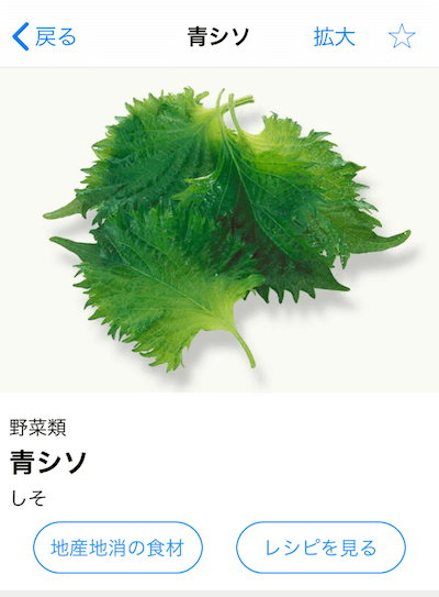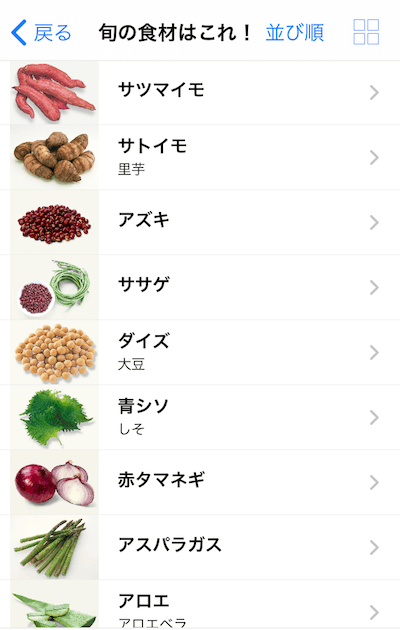 一覧から食材を選び、栄養や保存方法、特徴などの情報を見ることができます。