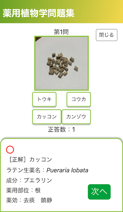 ランダムに生薬の写真が出てくるので、その写真を見て生薬名を選択します。