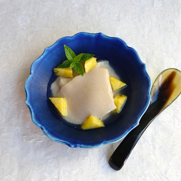 出来上がり〜!食感はつるんとしていますが、口に入れるとふわ〜っとお茶の花の香りが感じられて、とっても華やか!パイナップルを入れてみましたが、シロップやフルーツなしでそのまま食べてもおいしいです。薬膳茶で作った杏仁豆腐でプチぜいたくなティータイムになりました。アイデア次第でもっともっと楽しめそう!