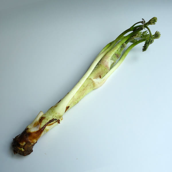「うど」は、体内にたまった余分な湿をとる効能がある食材。寒さと湿によるむくみ、足腰のだるさを取り除きます。漢方薬にも入っているほどで、筋と骨を丈夫にします。写真は山うど。栽培もののうどは白く、天然のうどは緑をしています。