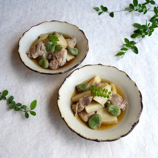 余分な水湿を排泄させる「そら豆」+痰をとる「たけのこ」で 春のむくみ対策和食。たけのこは体を冷やす寒性です。よく木の芽を合わせますが、体をあたためる木の芽で冷やす効果を和らげる意味もあるんですね。ちなみに、ゆらぎやすい春の時期を「木の芽どき」などということも。