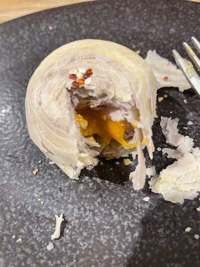 もうひとついただいたのが、タロイモまんじゅう(芋頭酥)。中にとろりとしたタロイモのあんが入っています。