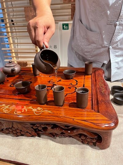 中国茶の飲み方って、こうやって小さな茶器ごとお湯をかけて、蒸らして、小さな杯に注いでいただくスタイル。杯が小さいのは、飲み過ぎるとよくないから?と思ったのですが、そうではなく、何杯もいれて香りや味の違いを楽しむからだとか。ひとりで飲むときは大きめのカップにいれて飲むそうです。