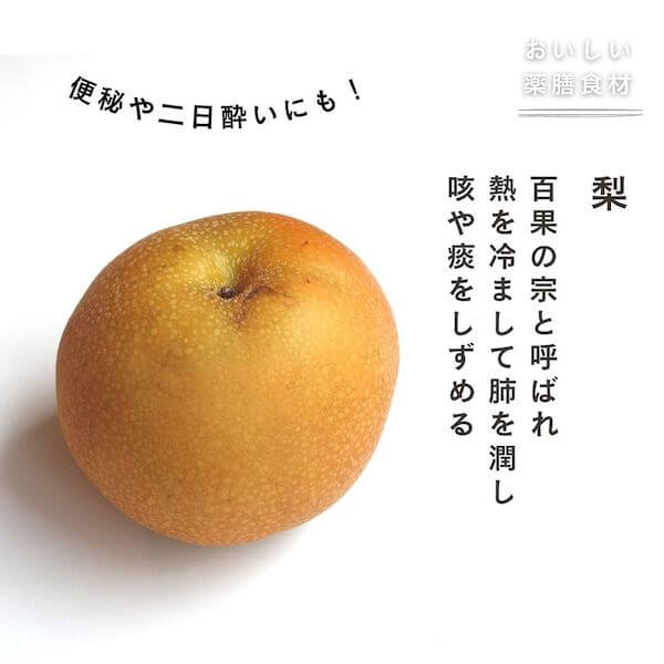酸甘化陰の代表的な食材といえば、梨。熱を冷まして痰を取るので、初秋の食養生や熱っぽい人に特にオススメ。肺や気管などの呼吸器系を潤すので、乾燥肌や咳などにも効果的です。梨の皮は生薬にもなるので、食べられる人はぜひ。私は煎じてお茶にすることもあります。