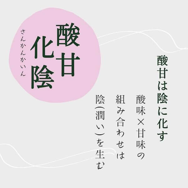「酸甘化陰さんかんかいん」という言葉は、「甘味と酸味を合わせると陰液を補う効果が高まる」という意味。
