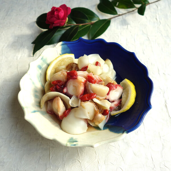 • 体に潤いと血を補う魚貝類、百合根などをクコの実入りマリネに。