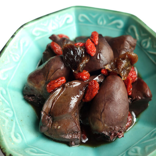 鶏のハツ、鶏レバーを赤ワインとしょうゆ、砂糖、塩、酢少々で煮込みます。