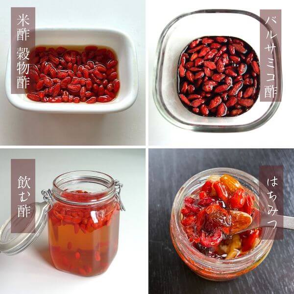 米酢やバルサミコ酢、飲む酢のほか、黒酢、りんご酢、ざくろ酢など、お好きな酢に漬けてみてください。クコの実も酢も、血を蔵する肝にはたらきます。