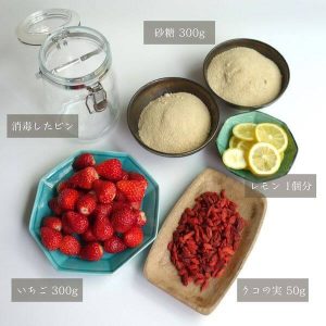 これは私がいちばんお気に入りのクコの実の使い方。毎年春になっていちごが少し安くなるといちごをたくさん買って作っています。
