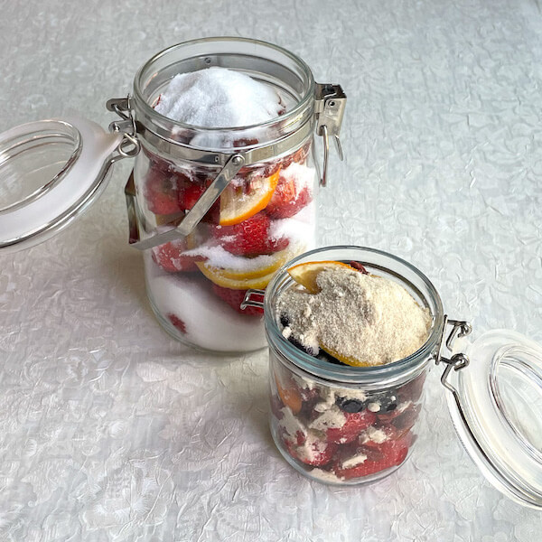 • ③ビンにいちご、クコの実、レモンを入れ、最後に砂糖が上になるよう材料をすべて入れる。