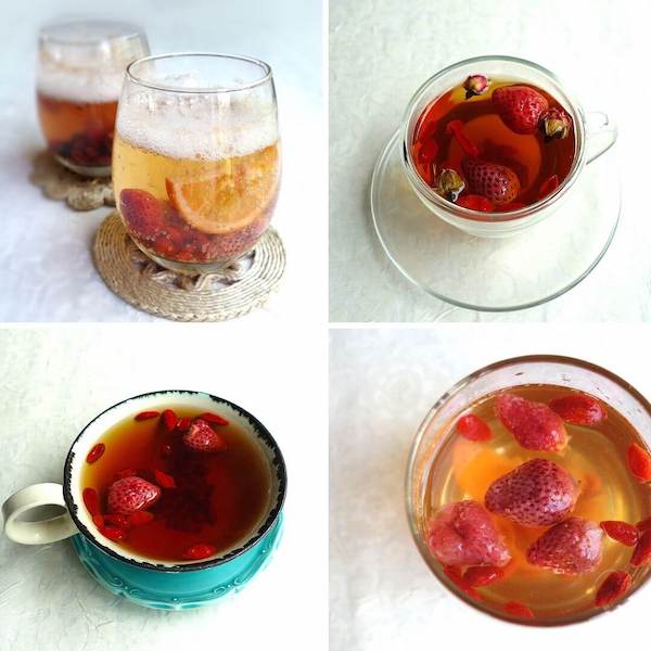春〜初夏の暑い日には「炭酸水割り」!甘酸っぱくてとても爽やかです。あたたかい紅茶に入れるのもおすすめ。紅茶にいちごとクコの実の甘酸っぱさが合います。牛乳に入れれば、いちごミルク感覚で飲めますよ。