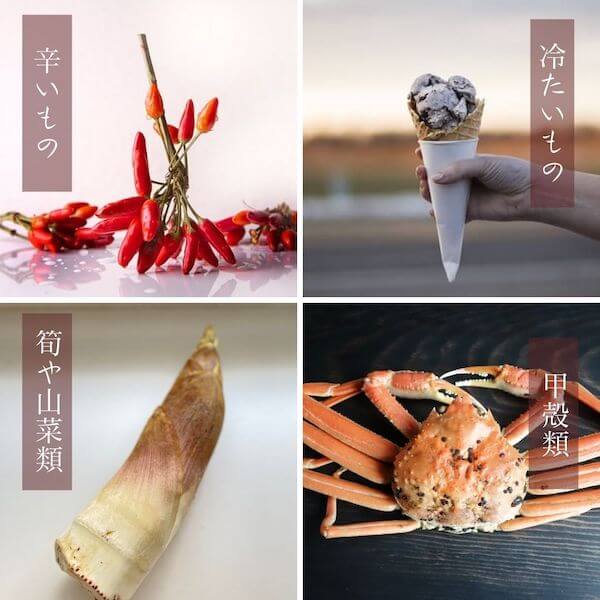 貝類、うに、えび、カニ、太刀魚、さば、すっぽん、淡水魚など - ✔︎油っこいもの・刺激性のもの