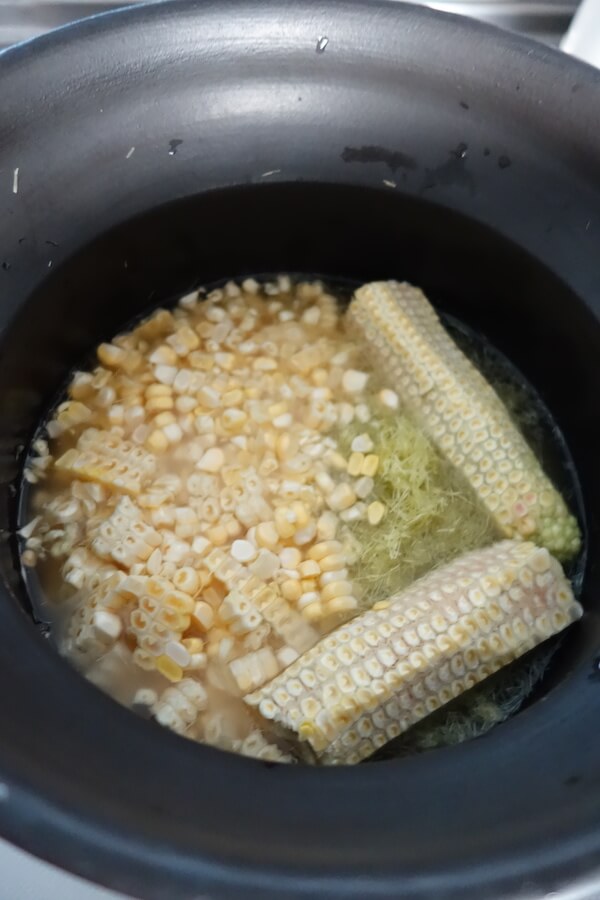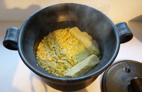 そして、洗ったお米、とうもろこしの軸、ひげ、実、塩としょうゆを、ご飯土鍋に入れて炊き始めます。いっしょに軸も炊くのは、軸にも甘みと栄養分があるから。炊き上がったら、取り出します。