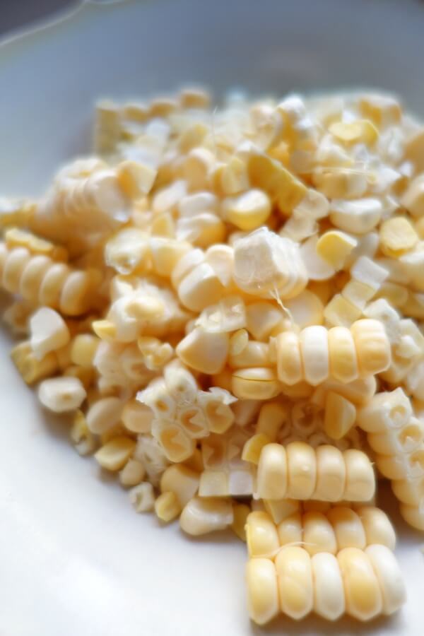 まず、とうもろこしは、皮をむいて包丁で身をそぎ落とします。
