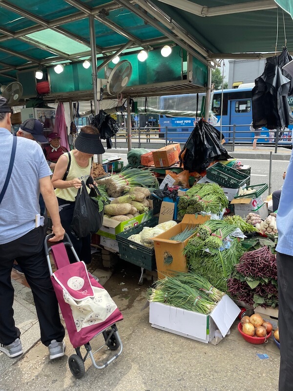 これは何!?と見ていたら、ニコニコ笑顔が素敵なおじさんが買っていかれました。調べてみるとズッキーニ。こんな形のズッキーニがあるんですね。韓国語ではホバク호박というそうです。