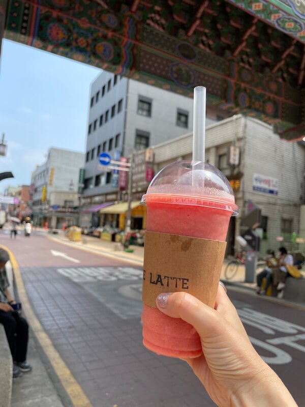 それにしても、真夏なので少し歩いただけでも暑い〜!あまりに暑いのでジュース屋さんでスイカジュースを頼むことにしました。漢方食材店に併設されていて、中でつながっていたもよう。薬食同源ということかな!?