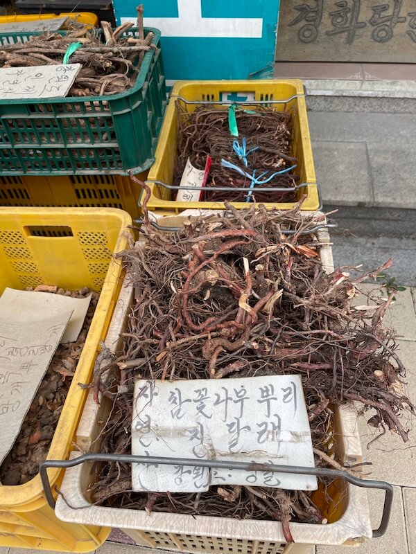 ここからズラズラーーッとお店がたち並んでいますが、いずれも生薬を扱うお店です。韓方医院もあり、日本人でも診察してくれるところがあるそうです。