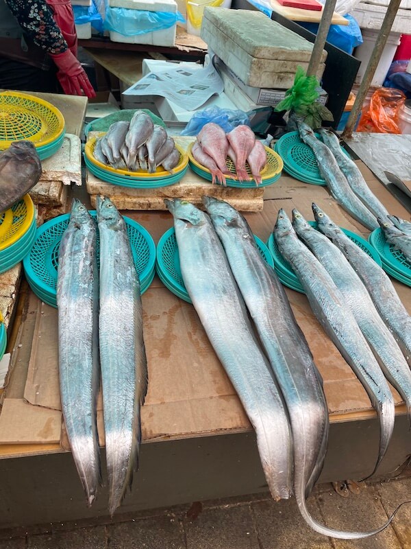 太刀魚など魚介類も、そのまま台に置いて売られていました。なかなかの迫力があります。