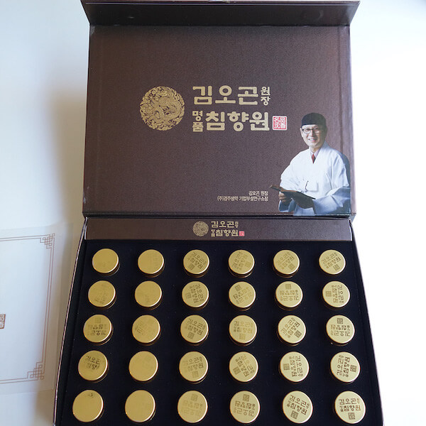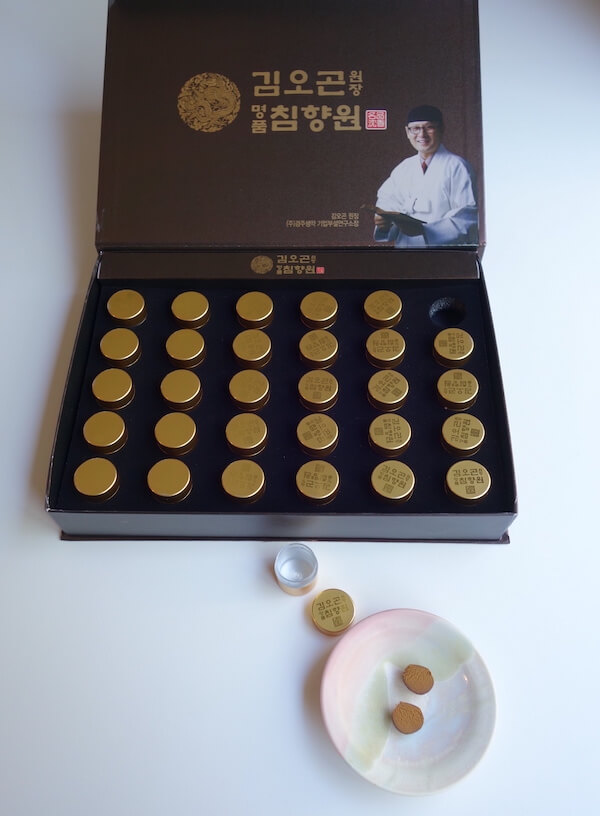 韓国健康食品研究所所長のキム・オゴン김오곤さんが考案した「沈香源30丸」(本来の拱辰丹ではないのかも?)。早い元気回復、活力増進、認知症予防に役立つと書いてあります。